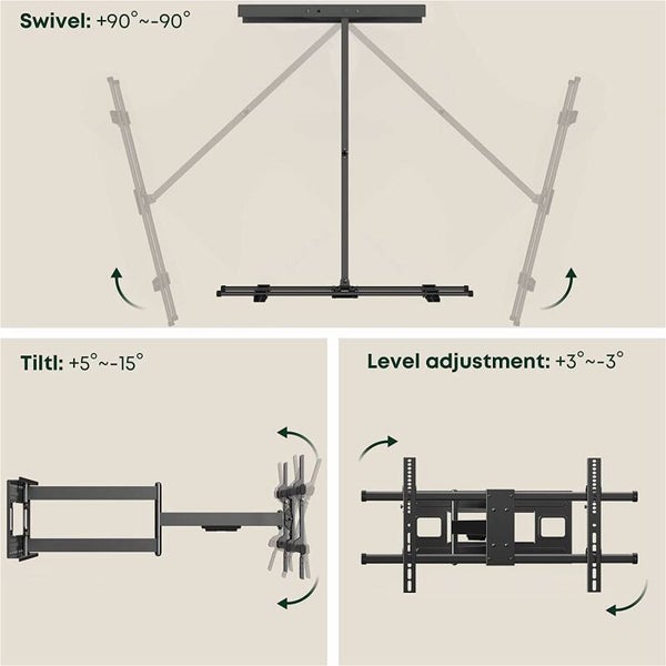 - Optimale kijkhoek: Wandafstand: 8,2 - 101 cm. Ruimtebesparend tegen de muur op een afstand van ca. 8,2 cm of uitgeschoven tot 101 cm. De zeer stabiele tv-houder is uittrekbaar en kan gemakkelijk naar rechts en links worden gedraaid. Voor optimale instelling voor de kijkhoek is de houder tot +5 °/-15 ° kantelbaar en +/-3 ° gedraaid worden.