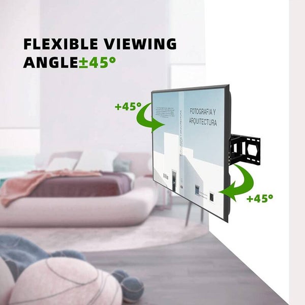 - Optimale kijkhoek: deze draaibare kantelbare tv-wandhouder kan +5 graden naar boven en -15 graden naar beneden worden gekanteld om verblinding te voorkomen en de belasting van hals of ogen te verminderen. De tv-houder kan naar behoefte 45° naar links of rechts gedraaid worden (maximale zwenkhoek hangt af van je tv). De horizontale correctie van ± 4° maakt een perfecte tv-nivellering mogelijk. Pas je tv-ervaring heel eenvoudig aan om de meest comfortabele kijkpositie te vinden.